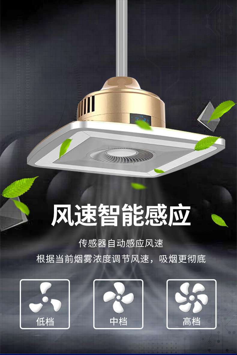 傳感器自動感應風速,根據當前煙霧濃度調節風速,三擋調節。多重凈化技術。