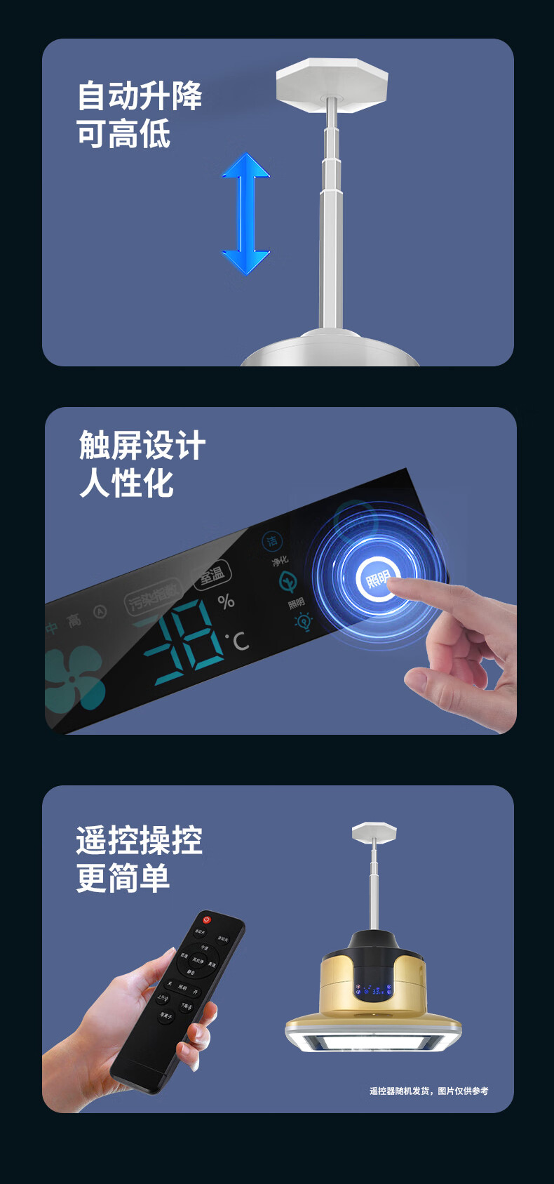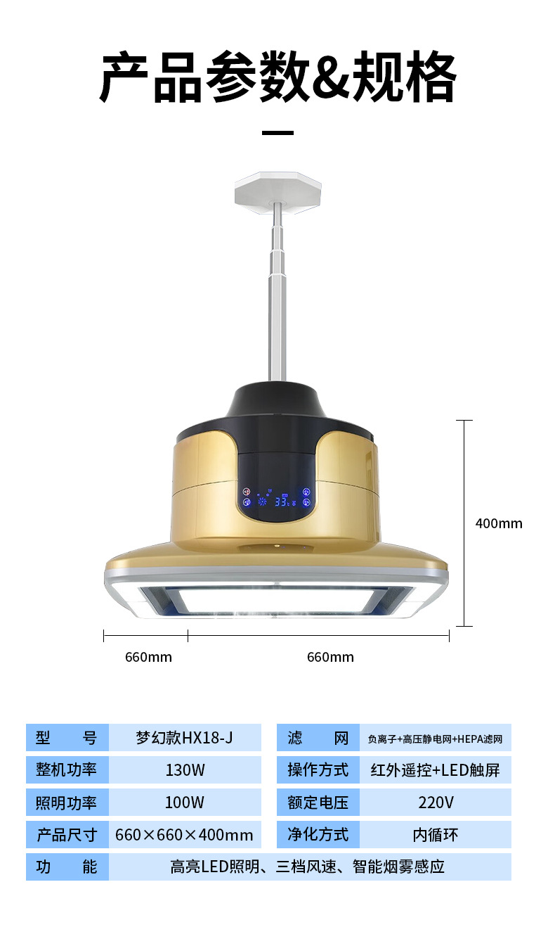 【功能】高亮LED照明、三檔風速、智能煙霧感應