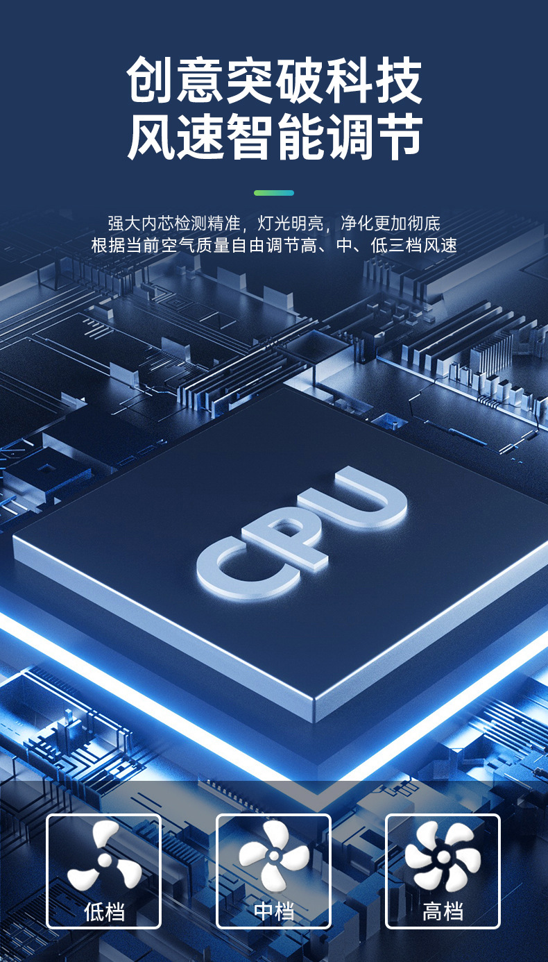 強大內芯檢測精準,燈光明亮,凈化更加徹底根據當前空氣質量自由調節高、中、低三檔風速。